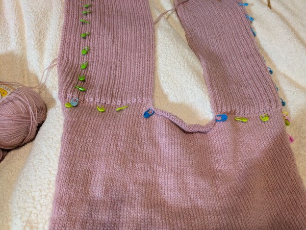 後ろ身頃裾のゴム編みを編んで長さを決めないと、前身頃の長さが決まらないため、あちこち編みかけになってます