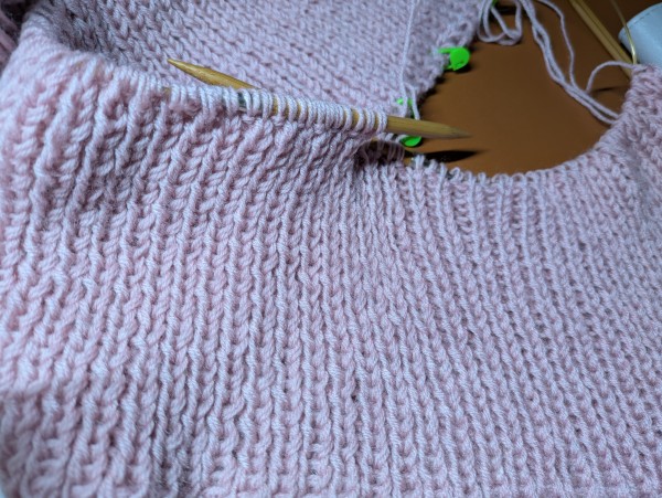 なんか後ろ身頃のメリヤス編みが、これじゃない感でもやもやしてしまい、結局新しい玉を出して2本取りにし、針は15号に、一目ゴム編みで編むように変更しました。