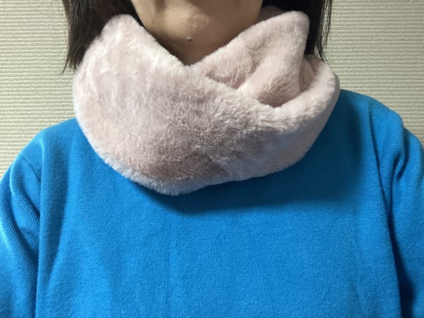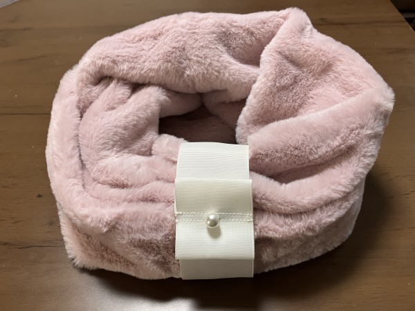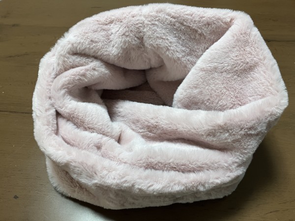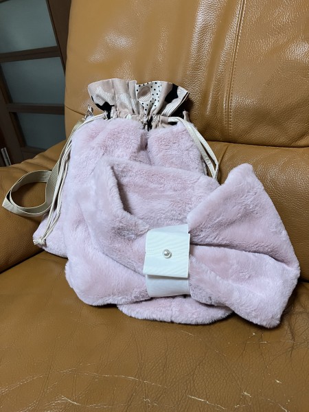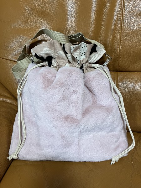 ピンクのファーで暖かスヌードと巾着バックを作成。