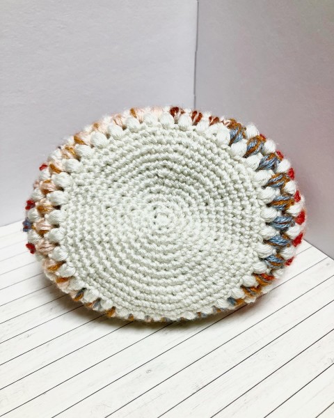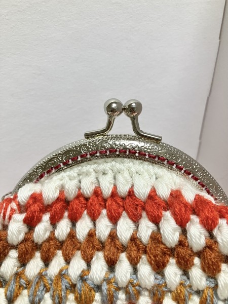 パフステッチのがま口ポーチです。グラデーションの糸のランダムの色合いで編むのが楽しかったです。内袋は森の動物柄です。