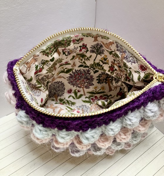 ぽこぽこしたパフコーン編みのポーチを作りました。グラデーションの毛糸で編むと、色の変化が楽しめて面白いです。中袋は森の動物柄です。