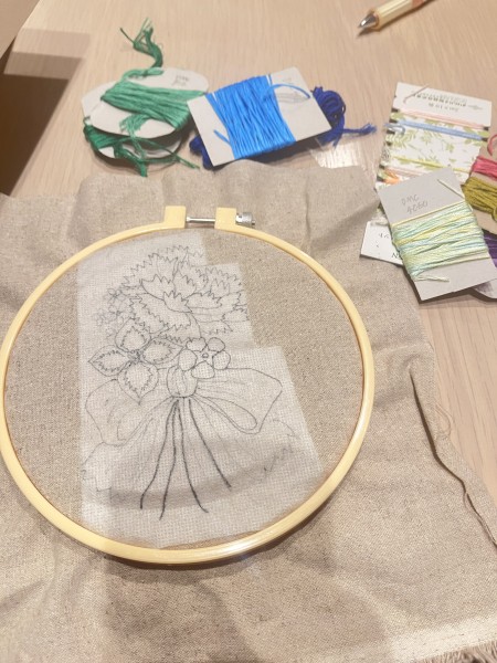 | とりあえず刺繍。 いづれ何かに仕立てるけどどうしよう…。 とにかく花束の刺繍がしたいのでやります。 |
