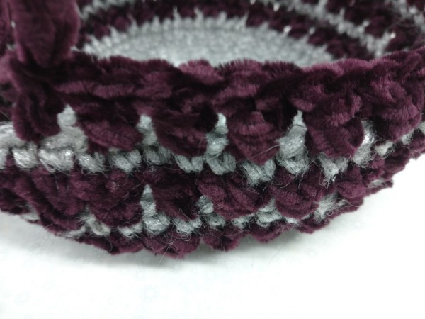 | リボンヤーンにモヘアを絡んだ光沢のある、珍しいファンシーヤーンをいただきました♪ 帽子を作ろうと考え、これまた!何を作ろうかと考えていたダーク系のワインカラーのモールヤーンを配色に長編交差編みをして、おしゃれなハットが出来上がりました♪ |