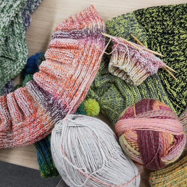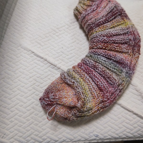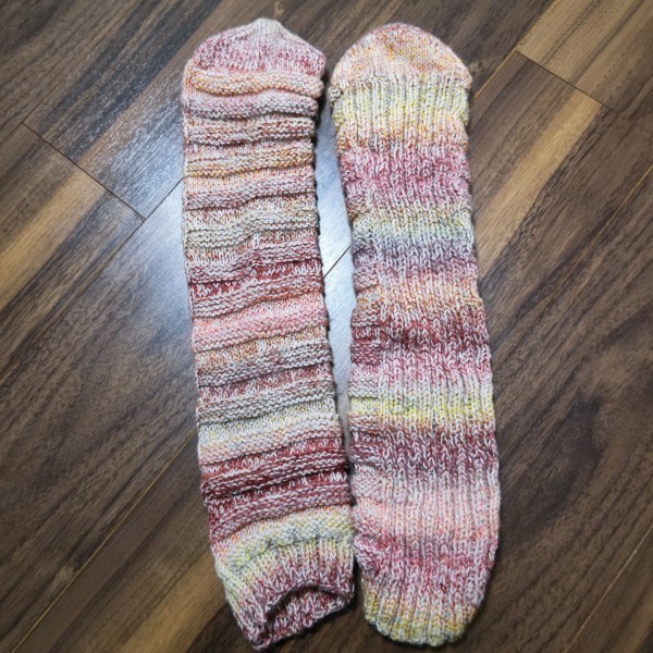 | ルームソックス。 華やかな色とオフホワイトの2色をひき揃えて編むマーリングに初挑戦しました。 ベルンド・ケストラーさんのマーリング編みの出版記念のレッスンで直に教わりました。通称バナナソックス。もう楽しくて!まだまだ編みたいです。 爪先糸が出てる写真は、猫にいたずらされ、糸を引き出された直後です。あとで、ちゃんと直しましたよ。 |