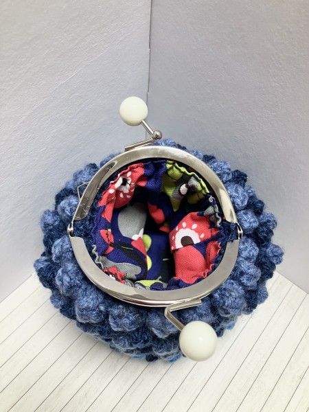 パフコーン編みのがま口ポーチです。中袋の縁にあえてタックを入れました。