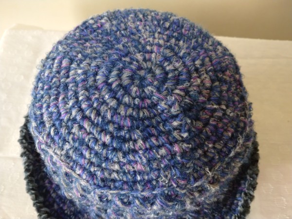 | 中細系の毛糸数本、カールヤーン数本、ブルー、紺、グレー、ピンクの6色を混ぜ合わせ、帽子編んでみました♪ 色を混ぜ合わせる事により、色調に深みを出してます。 縁編みは極太モールヤーンのため、全体のバランスを考え、バックこま編みと鎖編みで仕上げてみました♪ |