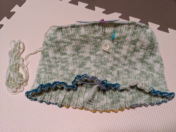 ウエスト部分最後の1段。ちょうど3玉目が終わりそう。同じ毛糸は在庫が足りない(あと1玉しかない)ので、足の部分(裾)は違う糸で編むつもり。ゲージ取り直すかゴリ押しで行くか悩み中。笑