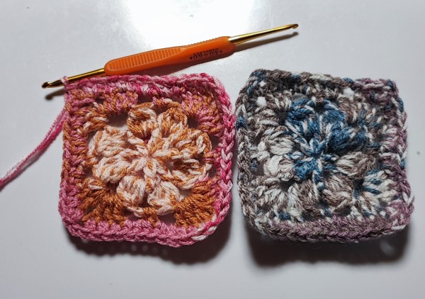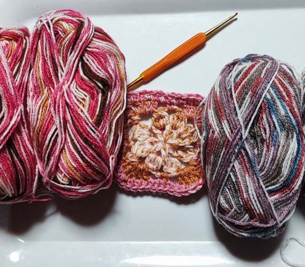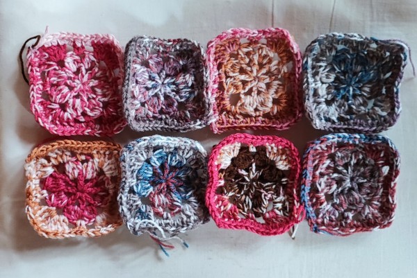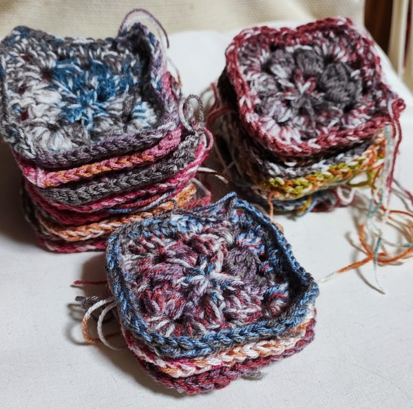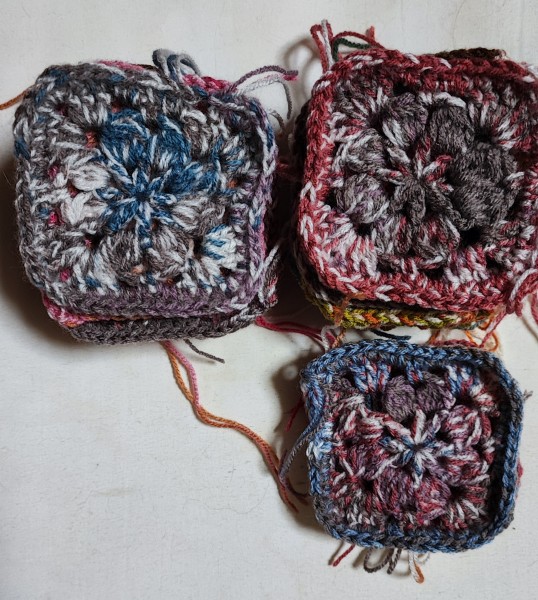 モチーフ編みがしたくなり、在庫から余り糸を見つけてスタートしました。1枚1枚異なるものが編めると思います。色の変化を楽しみながら編んでいきたいです。