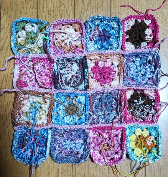 しまい込んで放置していた32枚のモチーフを繋ぎ始めました。
