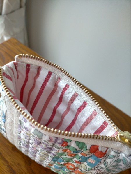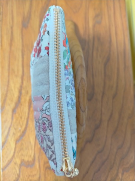 リバティの細長い生地を合わせてキルト生地に仕立てて作ったファスナーポーチです。仕立て方法はyasuminさんの方法を参考にいたしました。