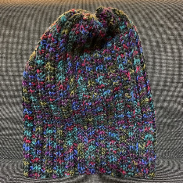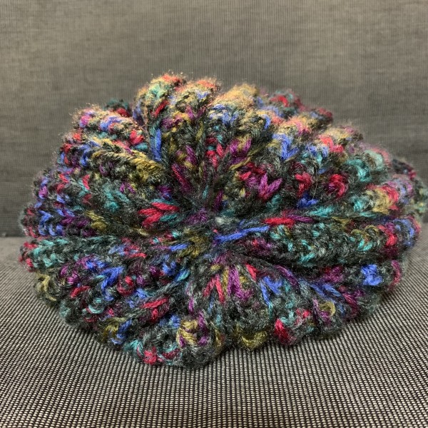 ダイソーで購入した毛糸で編んだニット帽です。毛糸は2本どりで、すべて中長編みで編みました。