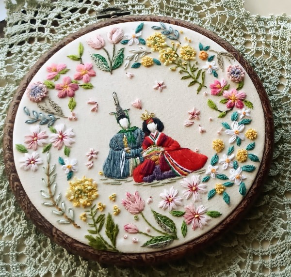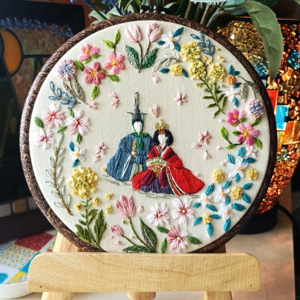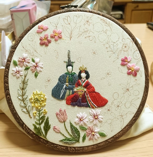 春の花々に囲まれたお雛様で可愛い雰囲気の刺繍フレームです。