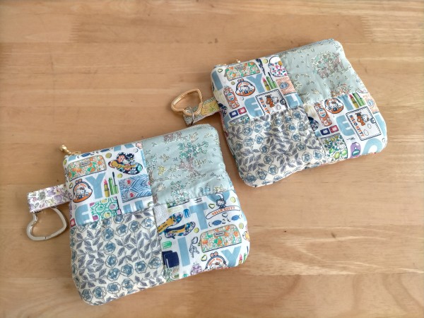 リバティ生地をパッチワークしてキルト生地に仕立てて作ったファスナーポーチです。