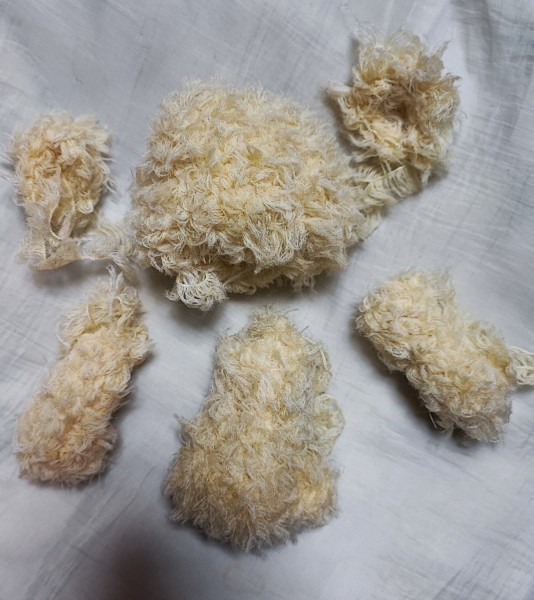 | あみぐるみのくまちゃん。 身長約24cm。 毛足が長く優しいお顔の子です。癒されます。 2024年12月15日に編み始め。糸が足りなくなり足と鼻が編めず。買い足しに行き、糸を確保したらそのまま放置。完成にこぎつけました。 SeriaのリトルバニーとDAISOの細いモヘアの2本どり。 |