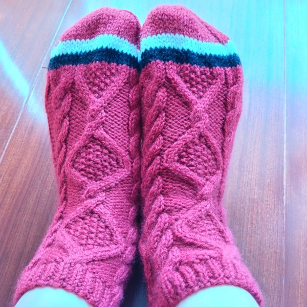 | アラン模様の靴下を編みました。 カーディガンの残り糸と、間違えて買った1玉を使いました。糸が足りなくなって、白黒の糸も混ぜましたが、いいアクセントになったかなぁと思います。 アラン模様模様はごしょう産業さんのソックスのレシピから。でも靴下全体は『スウェーデンから届いたニット』の編み図で。靴下は難しくて、ごしょう産業さんのレシピでは作れなくて…。なので、模様がちょっとズレてしまいました。 |