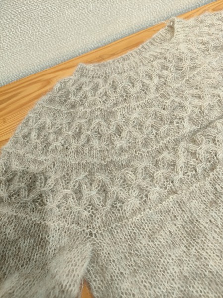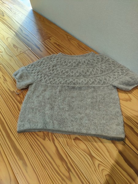 毛糸が足らず、裾と袖を変更してます。完成間近ですが、なかなかやる気が出ず、放置になってます