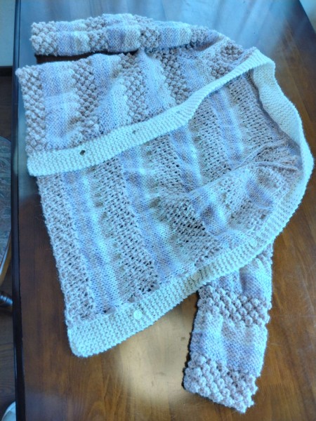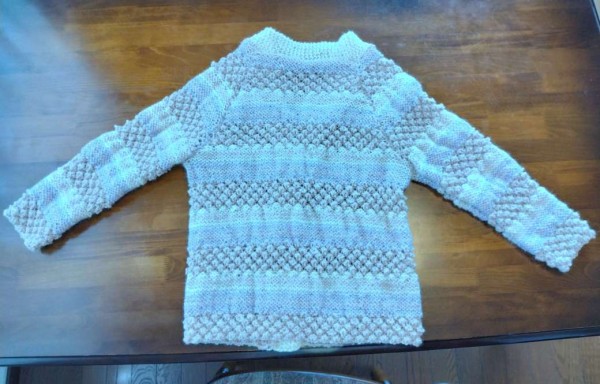 | ゲージを合わせるため、並太糸を8ミリジャンボ針で編んだので、フワンフワンの出来上がりです。模様編みとメリヤスのゲージが違うため増やし目減らし目を繰り返し、しかもラグランスリーブなので複雑でとても楽しかったです。 三國万里子さんの「冬の日の編みもの」を参考にさせていただきました。 |