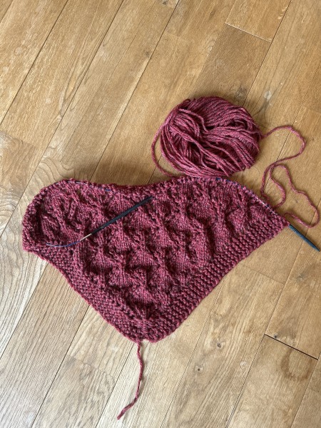 両辺のガーター編みと増やし目、菱形模様は半分ずらしながら縦に並んでいます