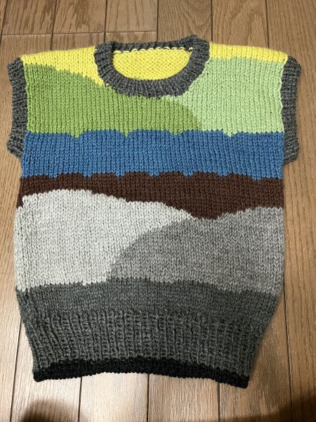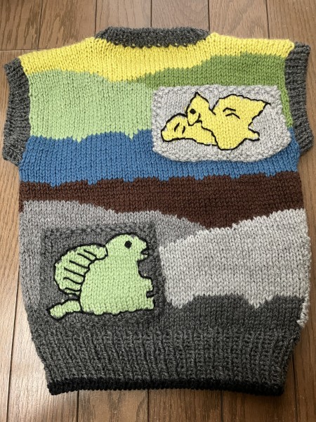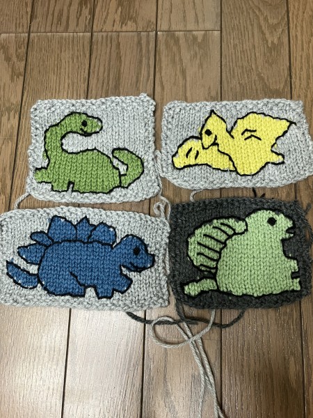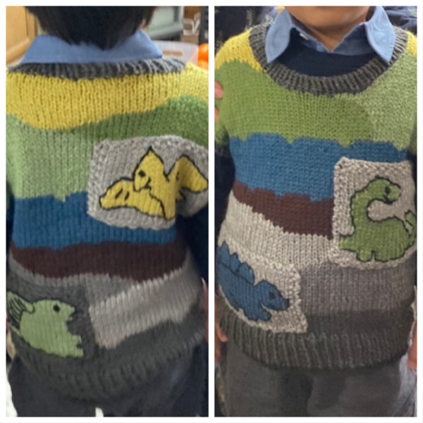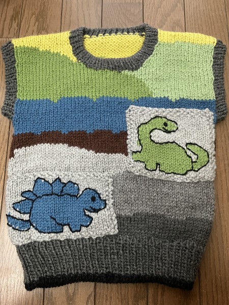 孫が恐竜好きだったので、ベストを編んでみた。フォルムが複雑なので、なるべく単純にし方眼紙におこし、編み込みをアップリケにして、付けてみた。ちゃんと恐竜に見えるか心配したけど、恐竜の名前を言ってくれて、「あったか〜い」と着てくれたので、ばあばとしてはとても嬉しかった♪