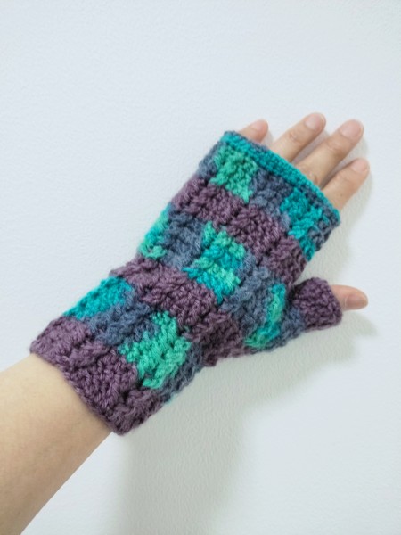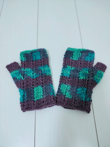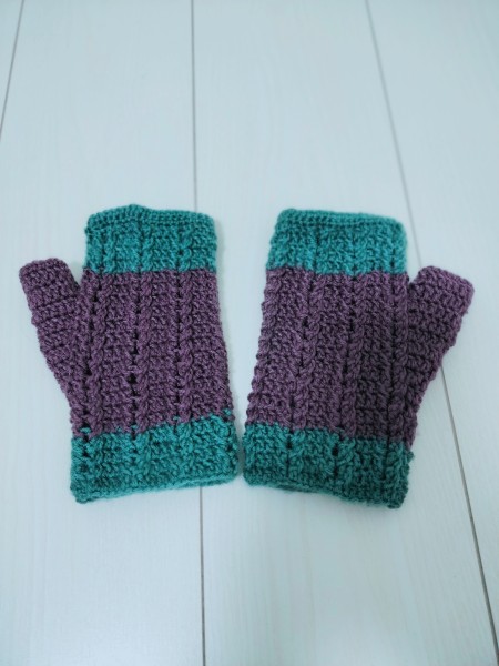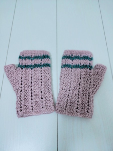 余り毛糸でハンドウォーマーを3種類編みました。余り毛糸なので色の組み合わせが難しかったです。ギリギリの毛糸もあったので完成して良かったです。