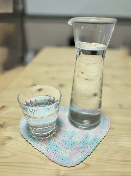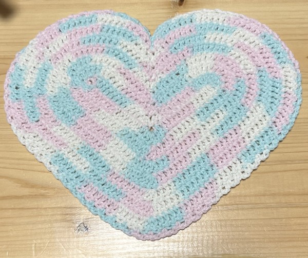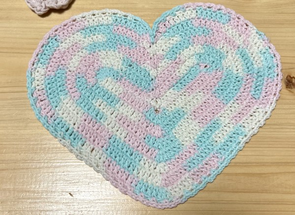 | 手編みのハンカチ ニッタオル101 p.90 ハート型 水を入れたカフェとグラス、ティーポットとティーカップなど、2つのものを一緒に置くコースター代わりのマットにちょうどいいサイズです。指定針5号のところ、細い毛糸と3号のかぎ針で編んだので、ハンカチには使えなくはないけれども、少し小さいかもしれません。 |