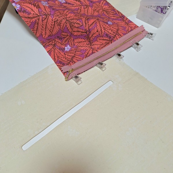 よくネットや本で紹介されているやり方では、ファスナーの布端が見えたままになってしまうので、「バッグの型紙の本」で紹介されていた別の方法で付けました。