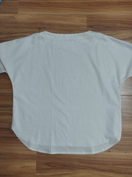 「ラクしてきれいにみえる服」のボートネックシャツ。去年同じ物を作ってみたら、とても着やすくてお気に入りだったので、綿ローンで新調しました。