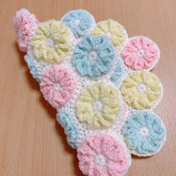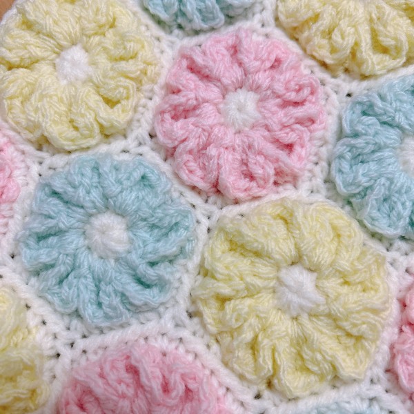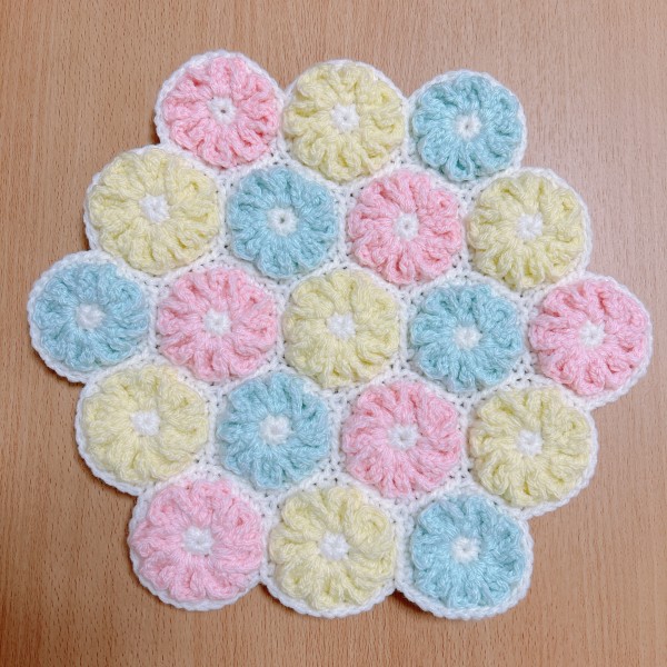 かぎ針編みで作った座布団です。表裏同じモチーフを編んで、白の毛糸で編みつないでいます。引き上げ編みで立体的に仕上げました。