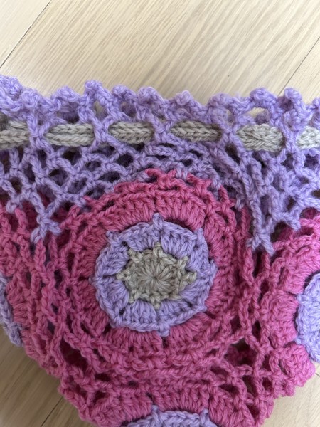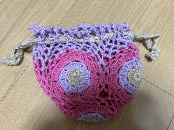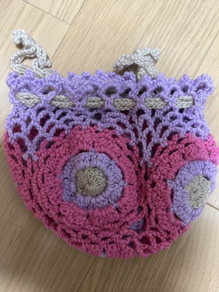 お花を5枚作って繋いで、入れ口を編んでいます。