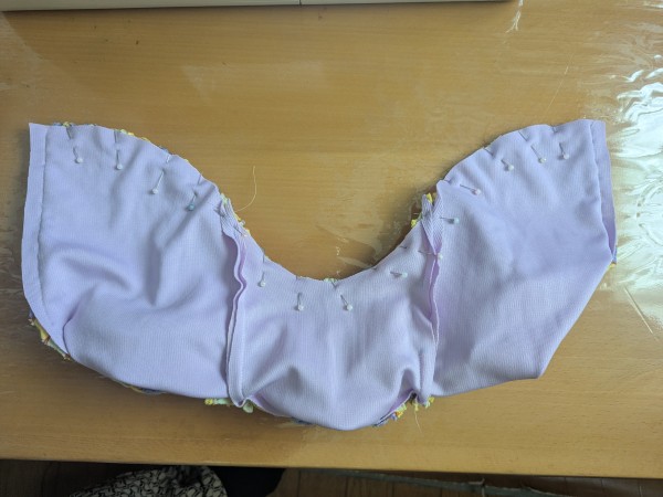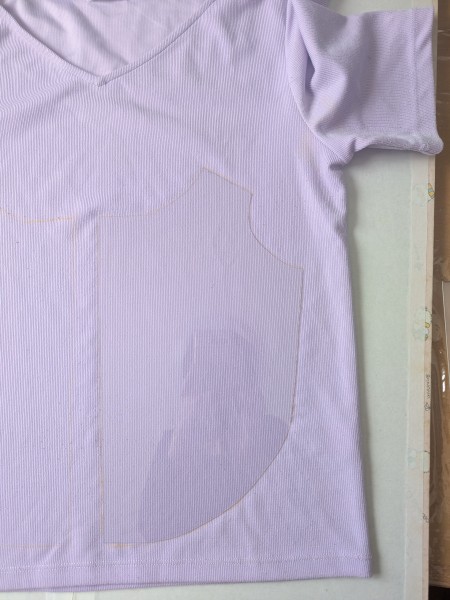 ラベンダー色の裏地にする生地が近くのお店にも無くて、着ていないTシャツを使いました。このポコポコの生地は、とてもお気に入りの生地ですが伸びやすいので気にしながら縫いました。首周りが大きすぎました…。