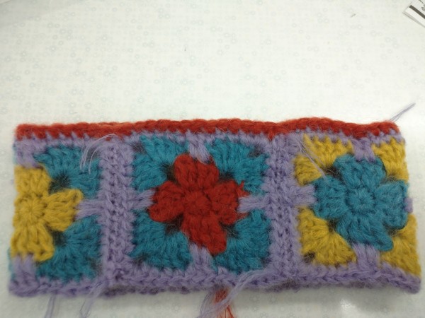 前回作った、ジグザグマフラーのモチーフが余っていたので、5枚ほど接ぎ合わせてみました。