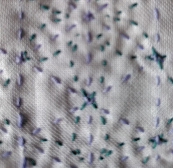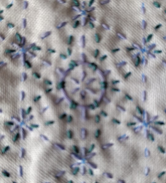 セリアの刺し子布「梅」花の中心をどうやって刺したら良いのか考えました。ぐるりと糸をくぐらせたら時計草のようになりました。