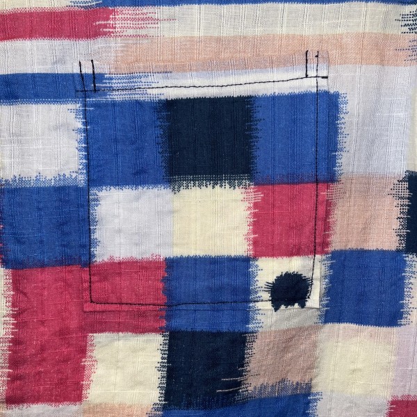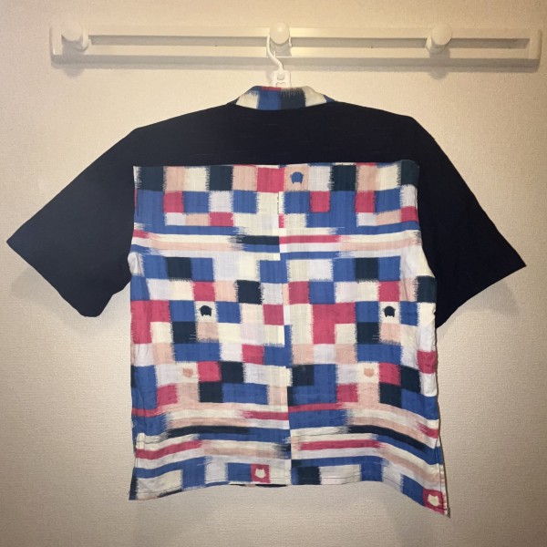 カラフルな部分は学生の頃、選択していた和裁の授業で購入したTSUMORI CHISATOの反物を使用。ネイビーの生地は買い足しました。市販の型紙を使用しています。なるべく柄がズレないように合わせました。