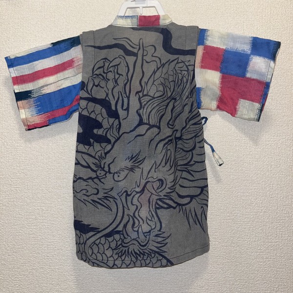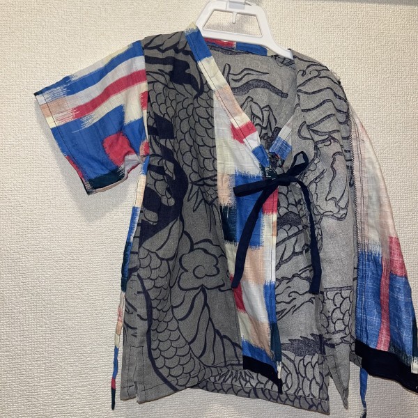 | ベビー甚平80サイズ(上)。 産前に作っていた父子でお揃いの100サイズは大きい為、今年の夏に着られるサイズの物を作成しました。 袖はメンズアロハに使用したTSUMORI CHISATOの生地です。龍の部分は百均の手拭いで龍を背負う形にしました。父子でリンクするようにしました。YouTubeの型紙なしで作れる動画を参考に作りました。 |
