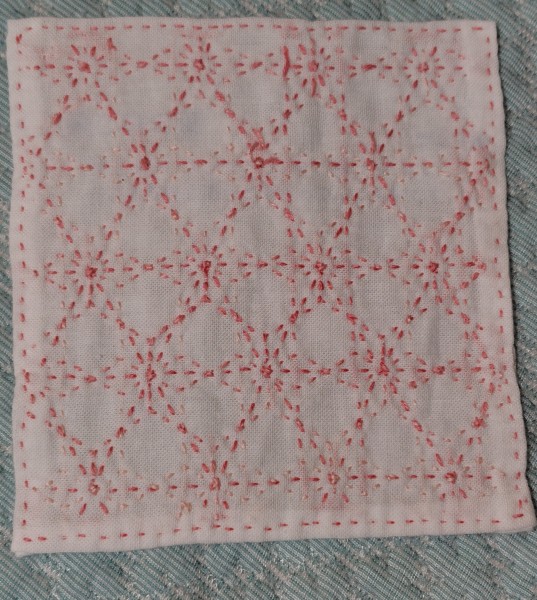 セリアの刺し子「飛び麻の葉」です。桃色の濃淡で刺しましたが麻の葉の模様がハッキリとしなかったのが気になりました。勉強になりました。