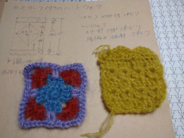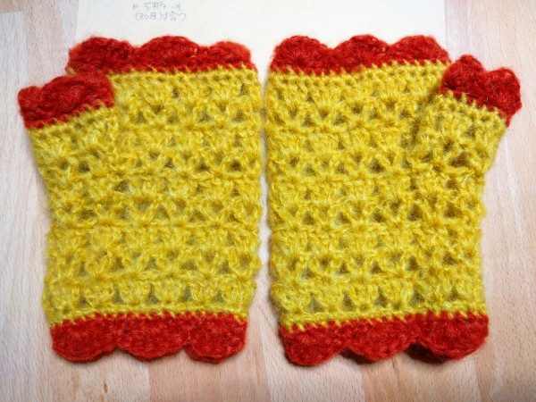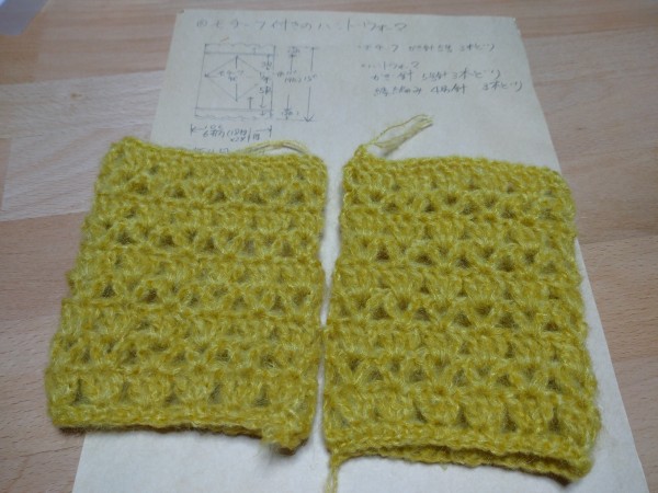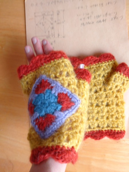 | 前回作ったモチーフのマフラーと帽子と一緒に、ハンドウォーマーを作ってはどうか!?と、言われる事もありまして、モチーフの形を整え、出来上がり寸法を決め、編み柄を決めて、今回は製作途中も載せてみようとしたところ、な、なんと!!、3回目のアップ中に操作を誤り!!削除してしまいました…(;o;) 確か、12名の方々さまより、『楽しみ』のマークをいただいのに…(ToT) 復活にはならず…やっと出来上がりましたので、再度完成品として、載せてみました♪ 出来上がり時期はとても暑い日でしたが、ハンドウォーマーを勧めてくれた方にサプライズのプレゼントをしょうかと思います♪ |