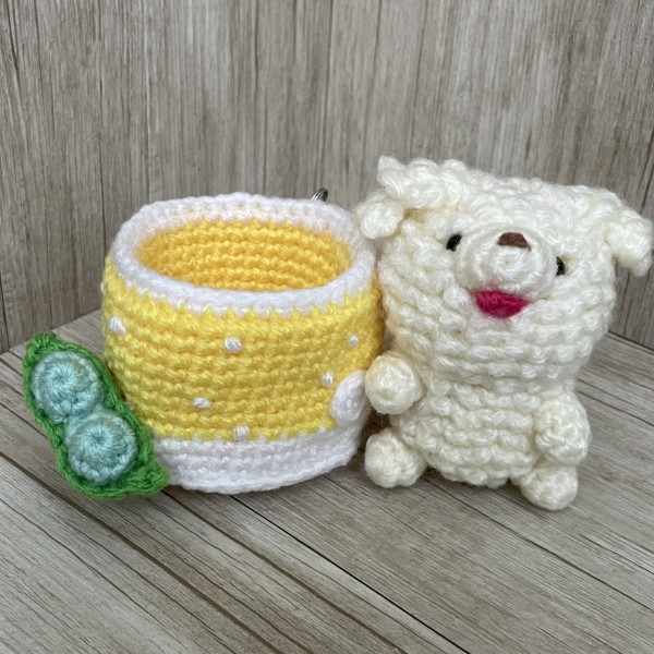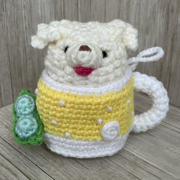 ビールの泡が、フワフワなわんちゃんになっているあみぐるみです。