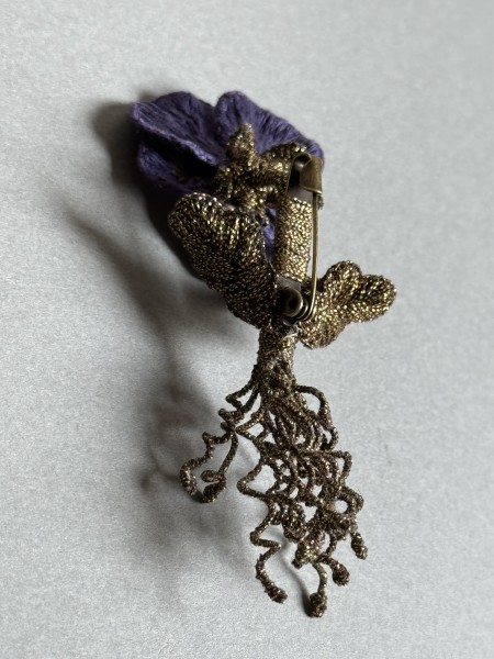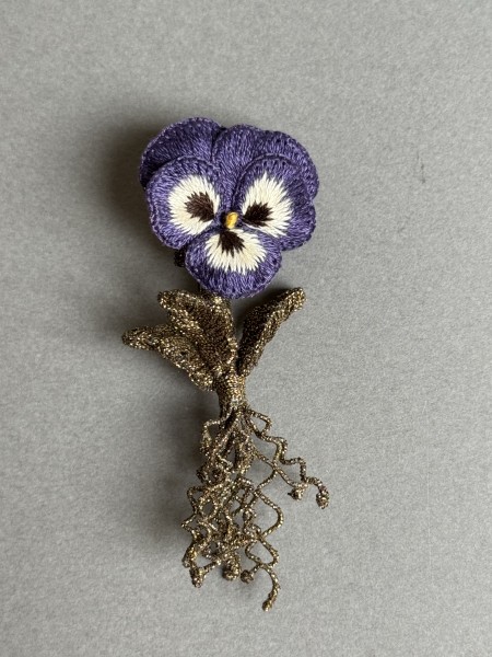 立体刺繍で作った根っこがあるパンジーのブローチです。