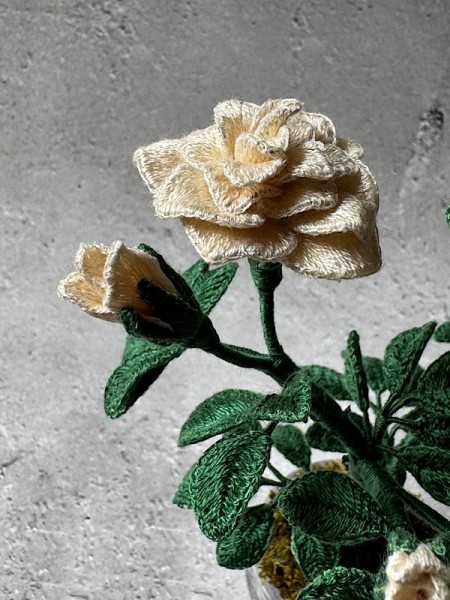 薔薇の花や葉はもちろんのこと、薔薇の棘まで刺繍糸で表現しました。