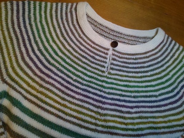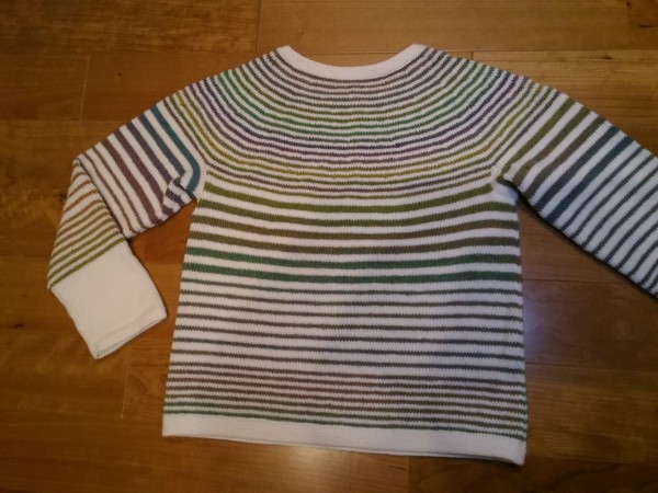 | しましまのセーターです。裾からパーツを別々に編んで、ヨークでまとめて編み上げる方法でした。元のパターンとはゲージも違うし、ヨーク丈を伸ばしたり前後差つけたりとちょいちょい変更して計算し直した分、ちゃんと希望の形になるのか不安もありましたが、無事に完成できてよかったです。 細めの糸を触りたくなって、つい始めてしまいました。セーターになる予定で、試し編みも兼ねて?!袖から編んでます。 |