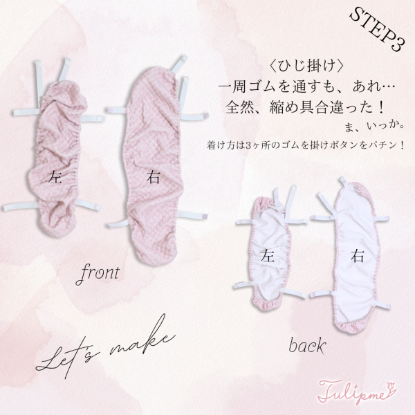 設計図もなければ、寸法も計らず実物に合わせて作っていたので、外してみたらゴムの引っ張り加減が左右でこんなに違ってました(笑)
