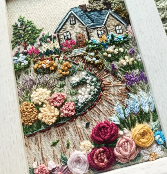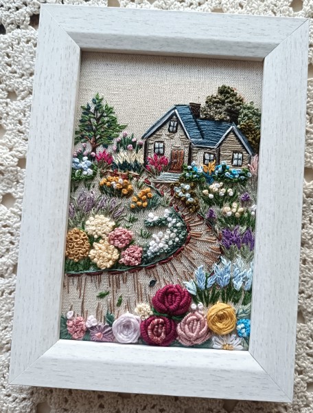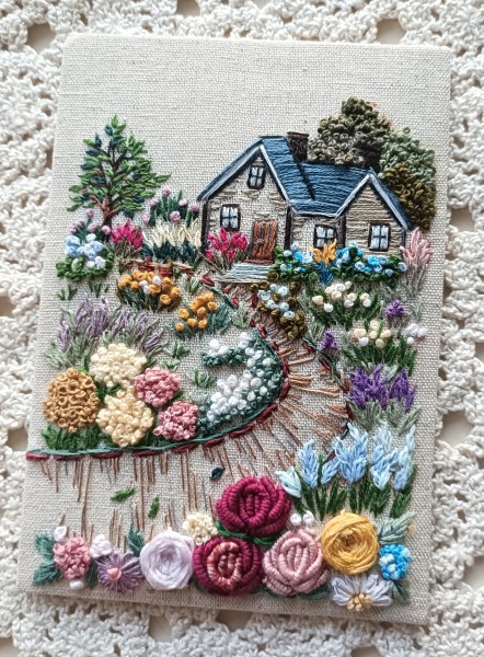 欧風の家と花いっぱいのガーデンを刺繍しました。