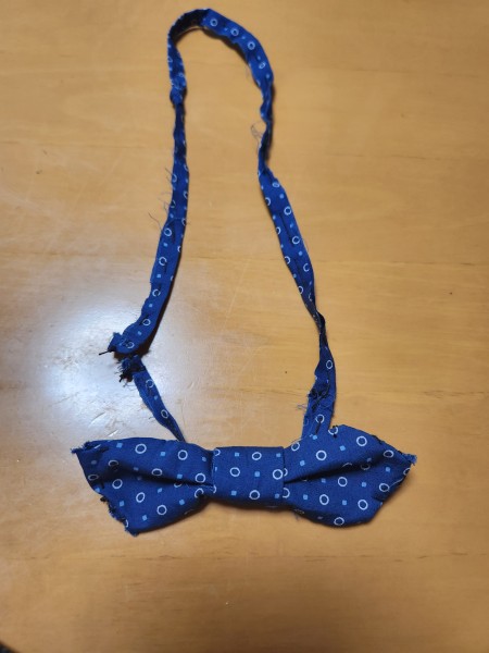 ぬのことふぁぶりっくさんのサイトに蝶ネクタイの作り方が載っていたので、作ってみました。ゴムではなく、紐を作ってホックで留めました。