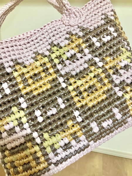 ビニールテープを4色使って編みました。猫の柄ですが、わかるかな?