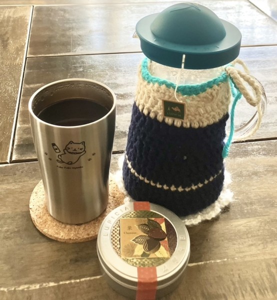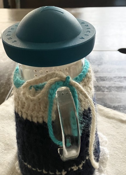 | 茶器カバー 本当はアイスティー用のハンディークーラーなのですが、ホットティー用に愛用しています。 持ち手の部分は筒にせず折り返して編みました。 色違いの鎖編み紐を2本編み付け、結べるようにしました。 |