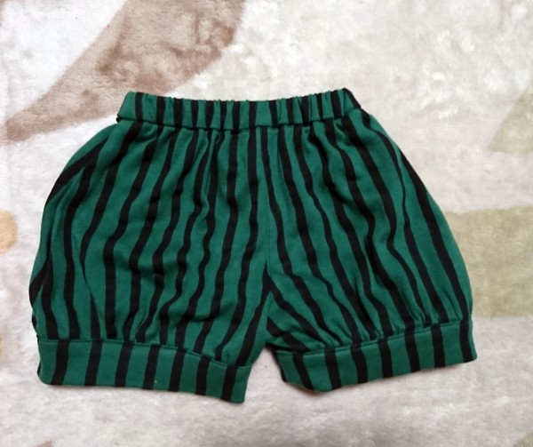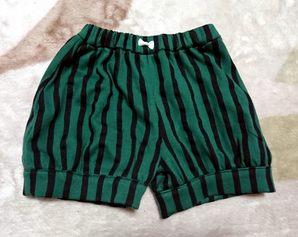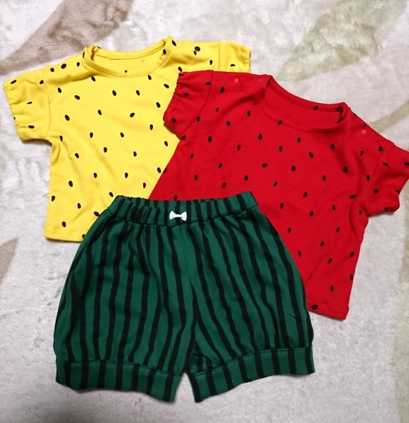 赤と黄色のスイカに皮の柄のパンツです。チェックのパンツと同じ型紙です。