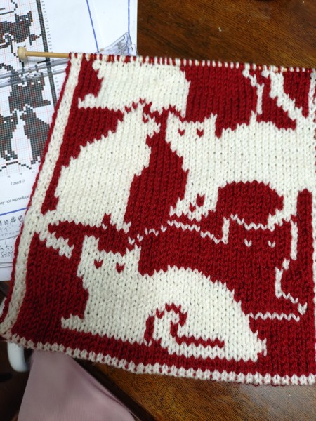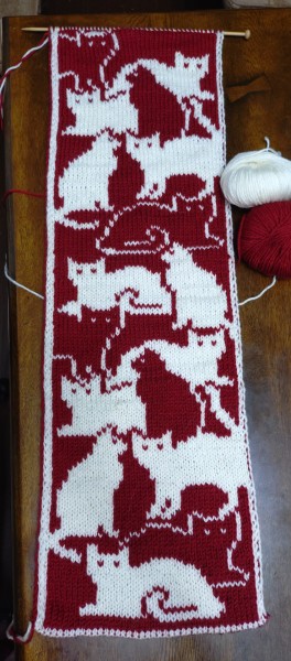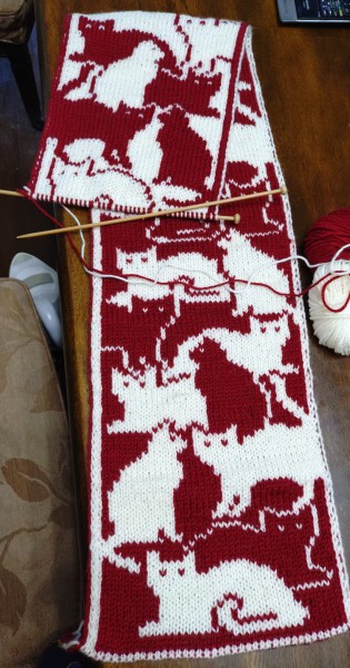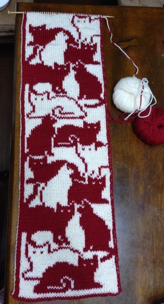 前回は中間部分に模様を入れずに編んだので、今回は全面に猫柄を編み込むことにしました。