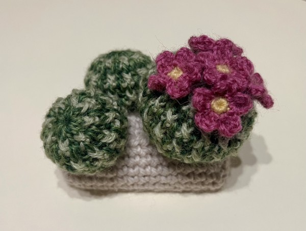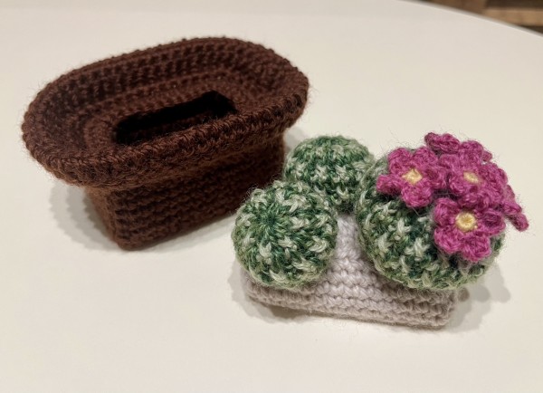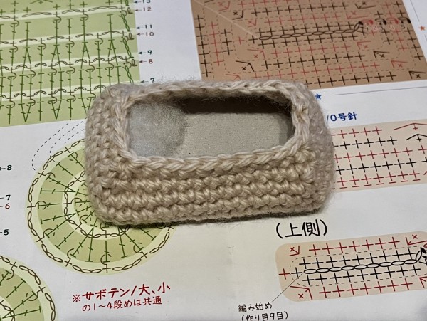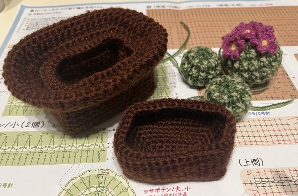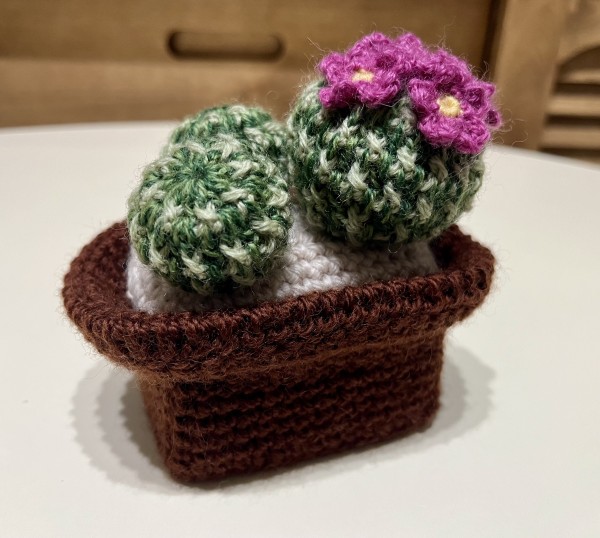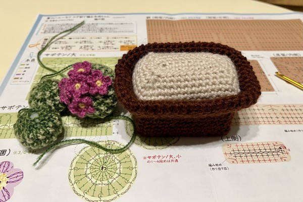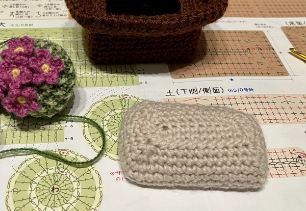 サボテンはあまりつまずかずに編めた!お花がかわいい。鉢は大きさだったり(画像の手前のは小さくなりすぎたやつ)編み目の数を間違えたりと、手戻りが何度かあり自分の計画性のなさにうんざり…でも最終的には満足のいく出来になった。鉢は厚紙で補強していて、久々にカッターを使って工作気分。