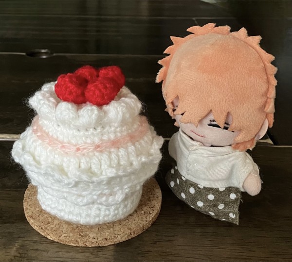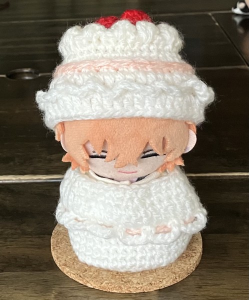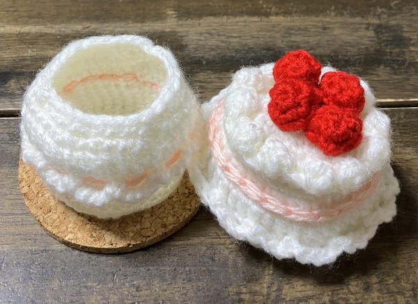 | 小さないちごケーキを編みました。 上の部分がふたになっています。 ちょっとした物を入れる小物入れとしてお使い頂くこともできますが なんと。 ぬいぐるみさんをいちごケーキに変身させてあげることができる編みぐるみです。 13cmのぬいさんまで変身可能です。 |