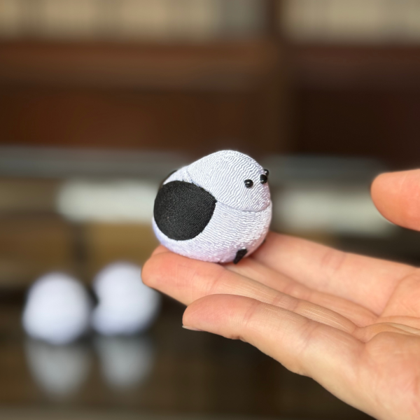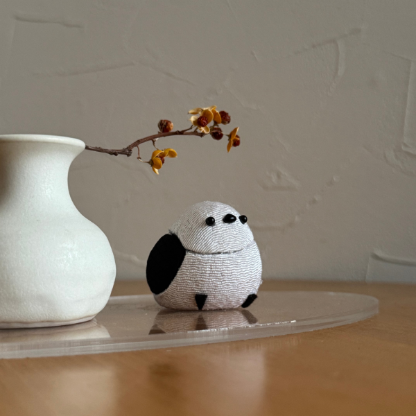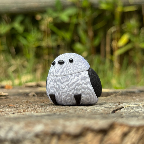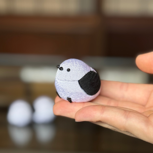 | 木目込みでできたシマエナガです。当工房初のシマエナガの木目込み人形。本当に手のひらに小鳥がのっているような重さと、シマエナガのふさふさ感を表現した人形用の裂地がこだわりポイントです。インテリアとしてだけではなく、ペーパーウェイトとしても気軽に使いやすい、そんな重さと大きさになっております。 | |